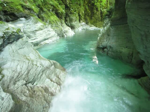 下部の両岸が切りたった函状の谷の乳白色や灰色河床の美しさ